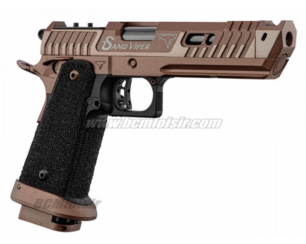 Fabriqué par Army Armament, sous licence officielle Taran Tactical Innovations, le GBB Sand Viper est une réplique airsoft du pistolet de combat 9 mm utilisé par John Wick dans le chapitre 4 de la saga cinématographique.