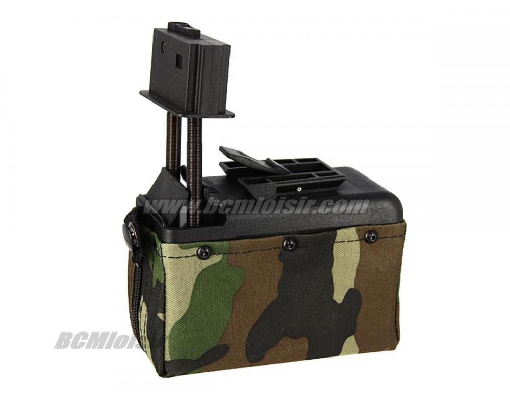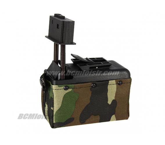 Ce chargeur d'une contenance de 1500 billes est recouvert d'un tissu moletonné woodland pour le proteger et le camoufler lors d'une partie airsoft.