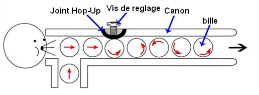 Et bien c'est très simple (pour quelqu'un qui réfléchie), le Hop-Up donne un mouvement de rotation à la bille. Comment? et bien la aussi c'est simple, une fois la bille engagé par le Nozzle, elle va être propulsée par l'air compressé dans le piston. Au tout début de sa course, le dessus de la billes va heurter une membrane de caoutchouc, ce qui permet de donner a la bille son mouvement de rotation. Comme sur le schéma si dessous: