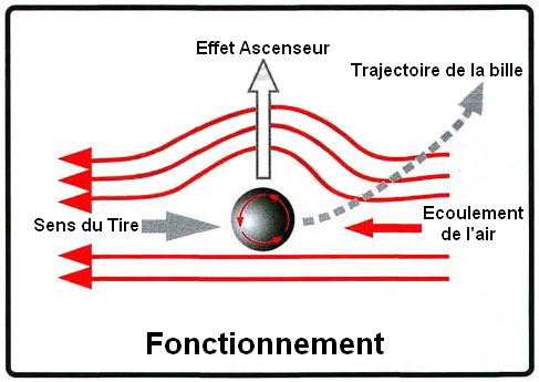 La rotation de la bille va créer un phénomène bien connu de nous les hommes, puisqu'il s'apparente au système d'une aile d'avion. La rotation de la bille va forcer l'air à passer au dessus de la bille, même pour l'air qui est en contact avec la partie basse de la bille. De cette manière, l'air qui passe au dessus de la bille a plus de distance à parcourir que l'air qui passe en dessous. Cela crée une aspiration vers le haut de la bille, que l'on nommera effet ascenseur. Une fois de plus un schéma est plus parlant: