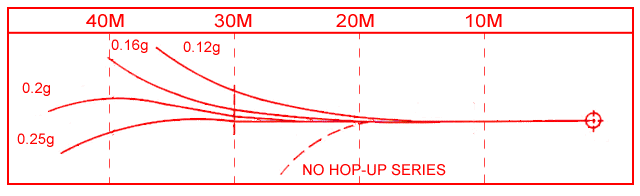 Et oui le Hop-Up ça se règle. Pourquoi? et ben tout simplement car en Airsoft on utilise différents grammages de billes, et que l'effet du Hop-Up n'est pas forcement le même sur tout les grammages. De plus un Hop-Up réglé trop fort, et la bille s'envolera, réglé trop faible, et la billes tombera. La trajectoire de la bille doit être particulière, la bille doit tracer droit sur une bonne distance, puis légèrement monter avant de redescendre. Pour obtenir ce résultat la seul solution et de tirer une bille, d'observer sa trajectoire, de régler le Hop-Up et de retirer pour réobserver. On fait cette manipulation jusqu'à avoir la trajectoire voulu. Voici un petit schéma des différentes trajectoires de billes. Ici le Hop-Up est régler pour de la 0.20gr, la trajectoire pour la 0.20 est donc bonne, le réglage Hop-Up n'est pas assez puissant pour la 0.25, et trop puissant pour la 0.12 ou 0.16.