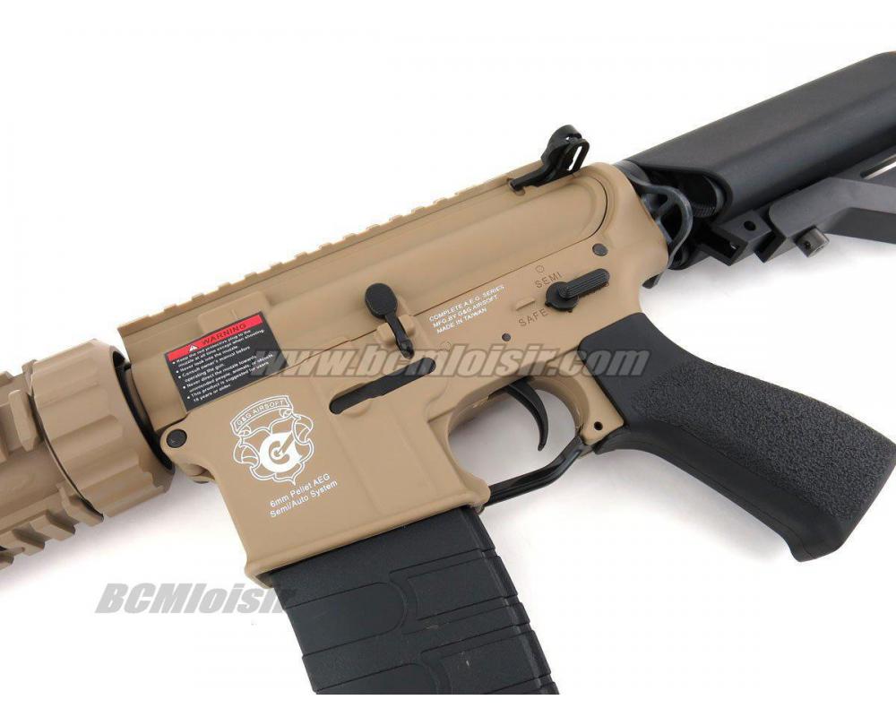 La réplique d'arme longue GR4 CQBS de type AEG de la marque G&G dispose d'un corps en fibres de nylon de très bonne qualité, un garde main en metal ainsi qu'un garde main RIS monobloc en metal.