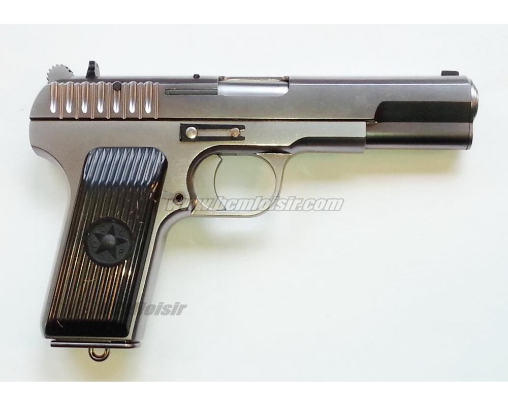 Cette replique entierement en metal de Tokarev est du plus bel effet avec son etoile sur les plaquettes de crosse et ses marquages russes gravés sur le coté.