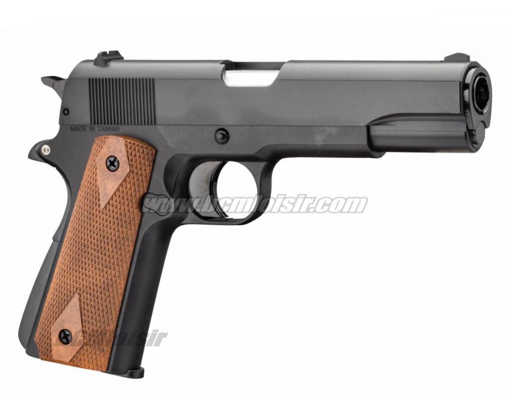 Superbe réplique du célèbre 1911 en version gaz culasse fixe, semi-automatique. Grace à ce système, ce modèle possède une grande autonomie. En fonction du gaz utilisé, la vitesse des projectiles peut atteindre 350 fps (avec des billes de 0,20g).