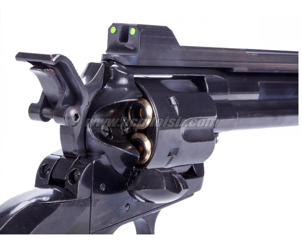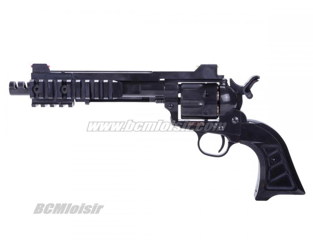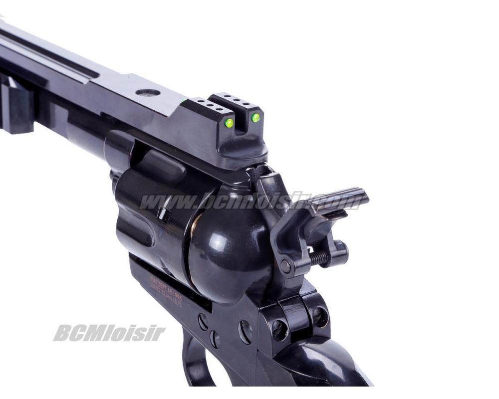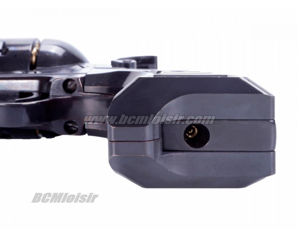 Des cartouches factices, contenant chacunes une seule bille, sont chargées dans ce revolver à percussion supérieure. Le revolver fonctionne exactement comme le vrai pistolet, y compris l'éjecteur qui éjecte rapidement les étuis usagés pour permettre un rechargement rapide.