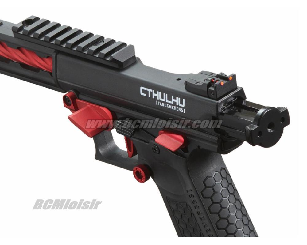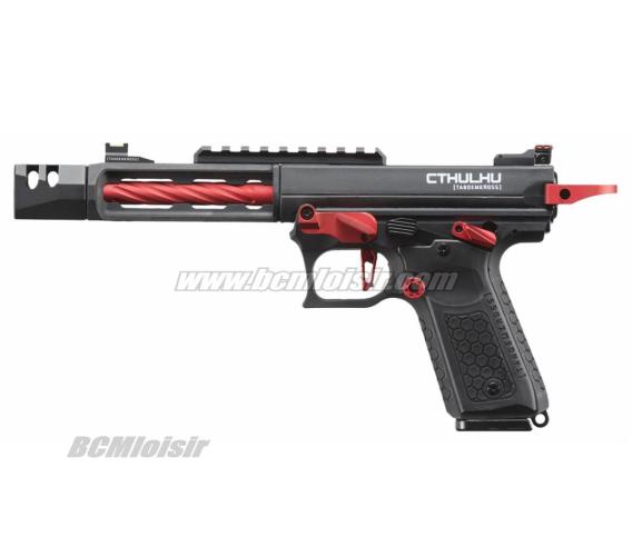 Découvrez le nouveau pistolet à gaz Tandemkross CTHULHU en noir/rouge. Fabriqué en polymère renforcé, ce GBB semi/full auto bénéficie d'un design entièrement sous licence. Cette réplique est doté d'un compensateur carré innovant "Game Changer Pro", d'un repose-pouce CNC, et d'une détente "squelette". De plus le Tandemkross Hivegrip assure une prise en main solide. Avec un anneau de chargement "Halo" et des viseurs à fibre optique "Eagle Eye", ce pistolet offre une précision inégalée. Le chargeur de 24 coups et le hop-up réglable renforce sa polyvalence.