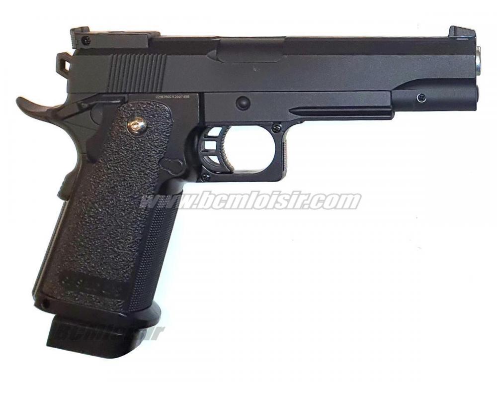 D'une conception entièrement métallique ce pistolet est idéal pour les débutants, ou les collectionneurs. Pas besoin de gaz ni de co2, pas besoin non plus de batterie.