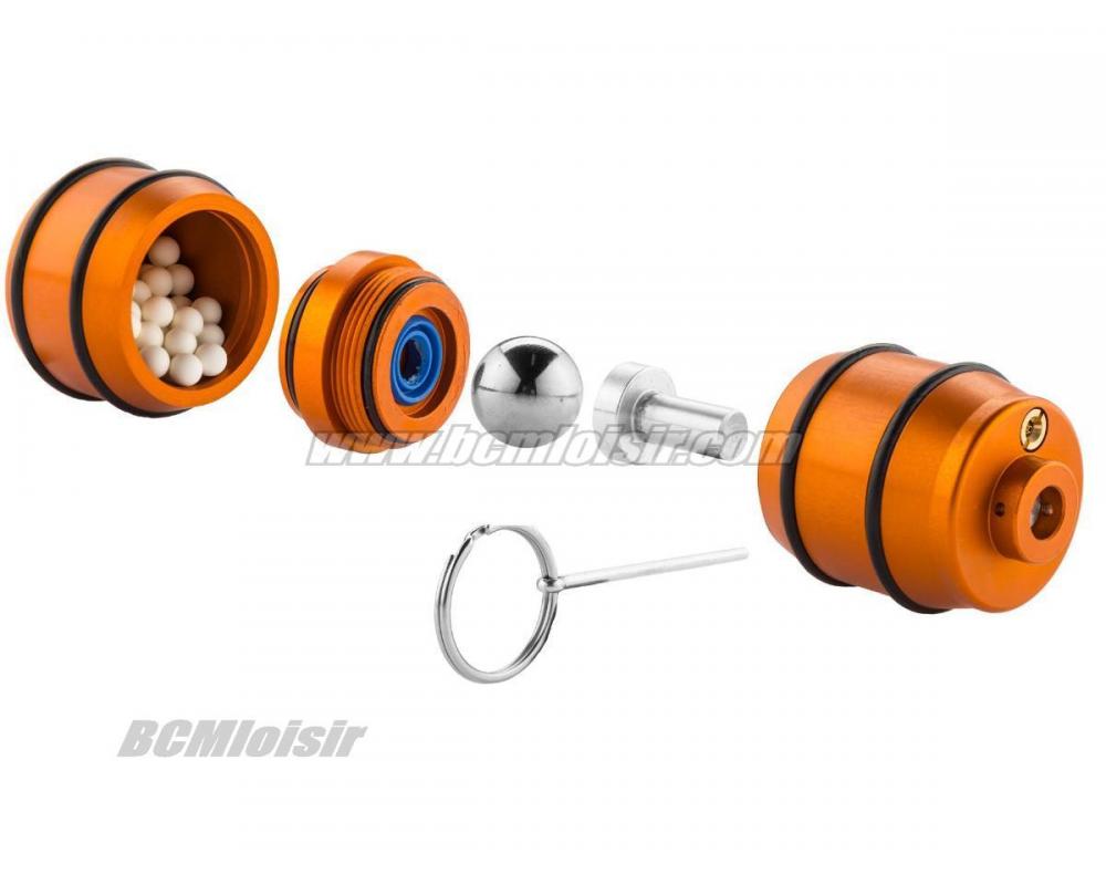 Il suffit d'insérer des billes dans le socle de la grenade, insérer du gaz dans la valve prévue à cet effet, d'assembler les 2 parties, et la grenade se déclenche à l'impact !