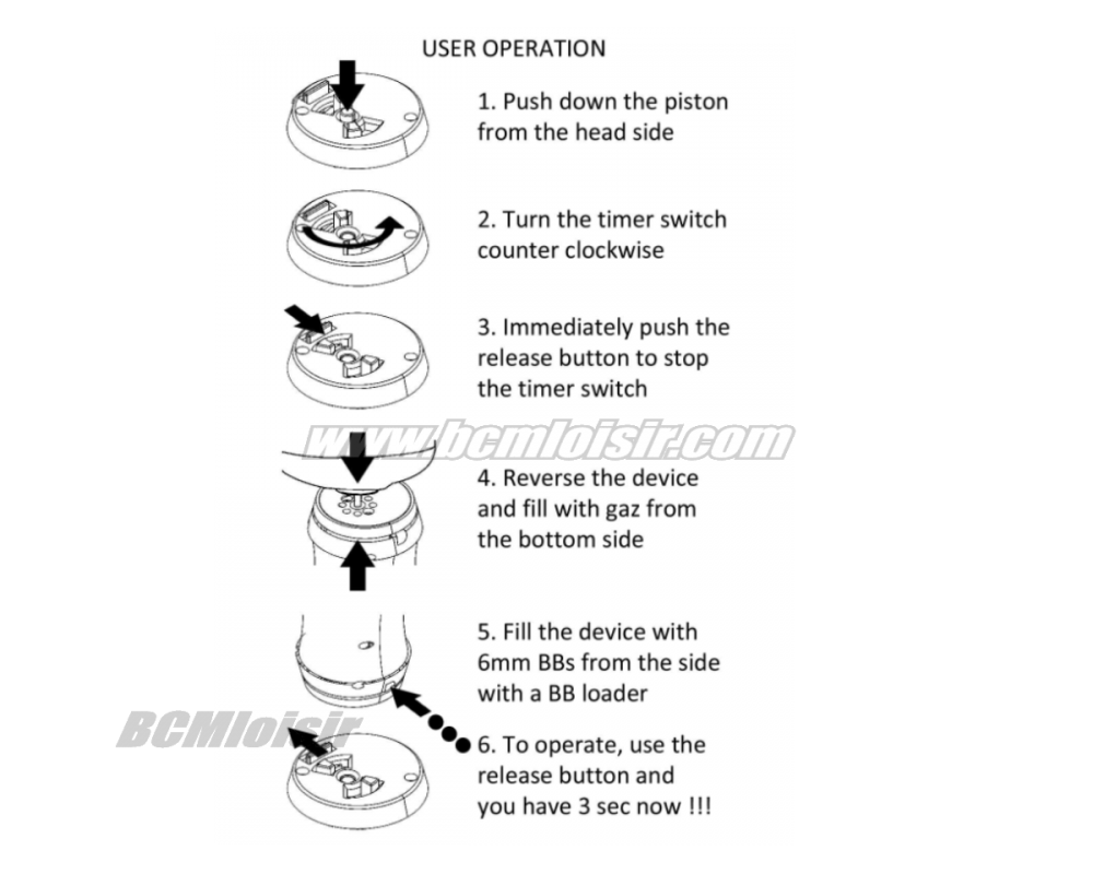- Design et assemblage artisanal en France - Coque en ABS renforcé - Mécanisme de retardement mécanique - Timer de 2,5 secondes - Facilité d'utilisation - Réutilisable à l'infini - Format compact - Capacité de 70 billes - Pas de pièces mobiles ni de goupille - Dispersion des billes sur environ dix mètres - Valve de remplissage conforme au standard WE