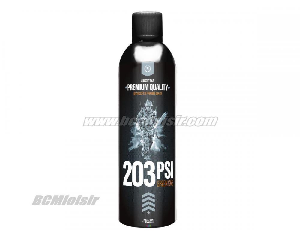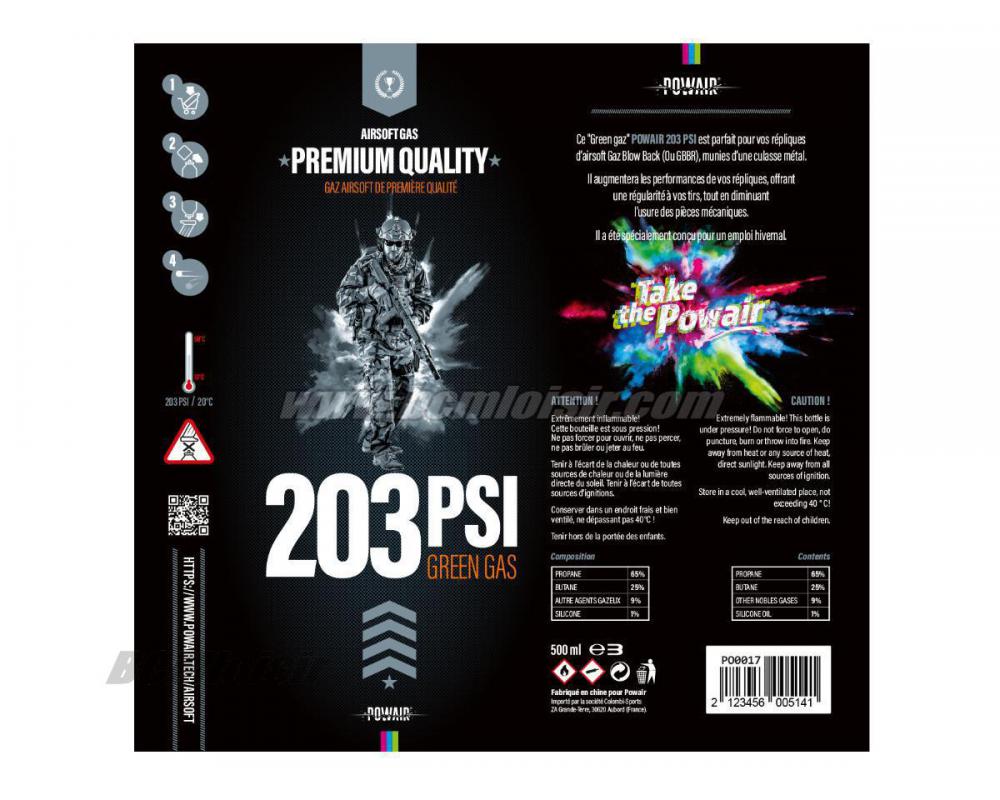Ce "green gaz" POWAIR 203 PSI est parfait pour vos répliques d'airsoft Gaz Blow Back ( ou GBBR), munies d'une culasse métal.
