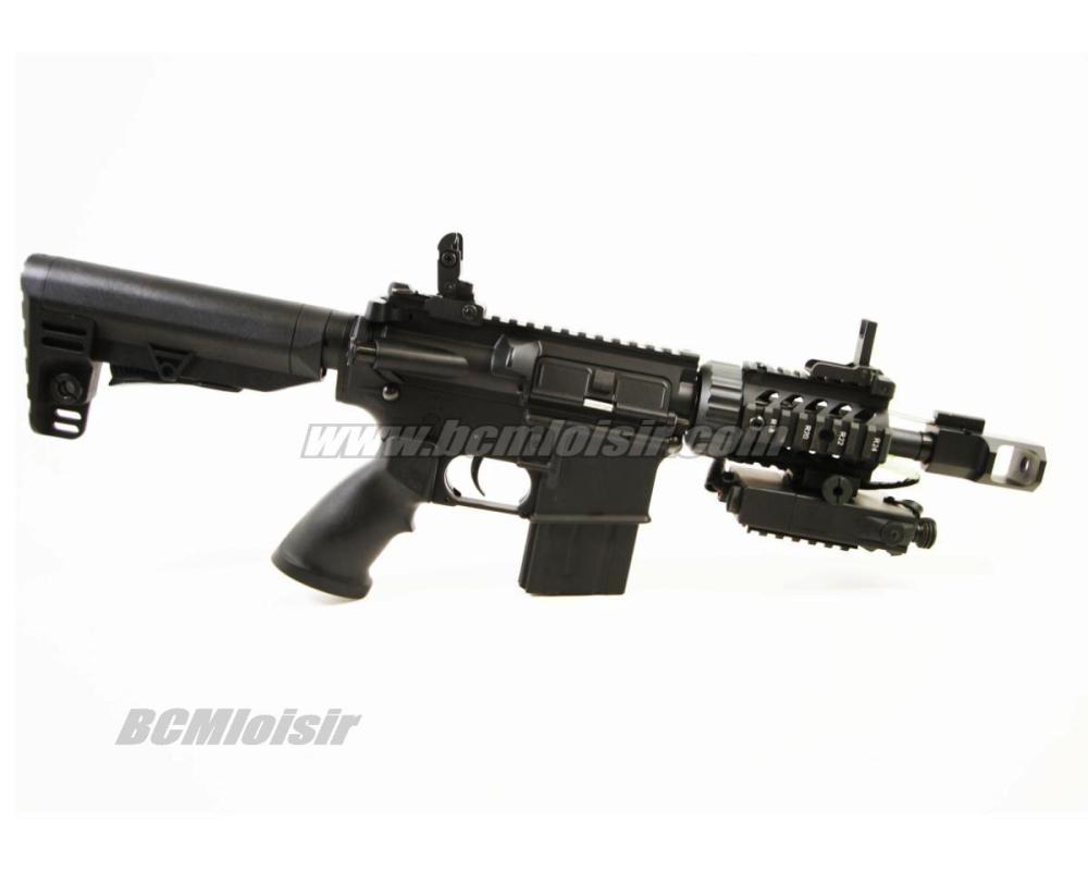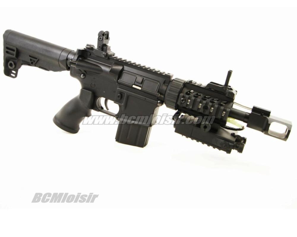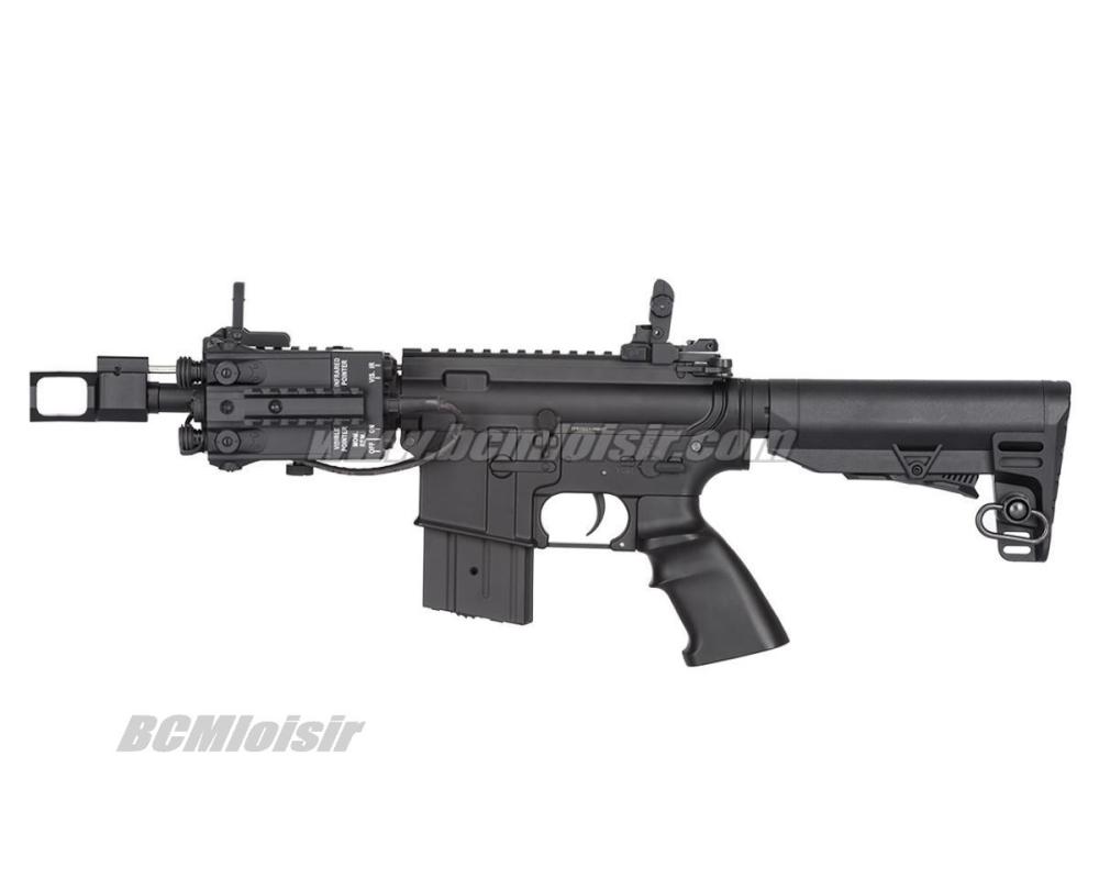 L'originalité n'est pas en reste sur cette réplique, frein de bouche démesurée, chargeur court style M16, crosse modernisée, boitier AnpeQ full métal et organes de visée rabattable.