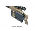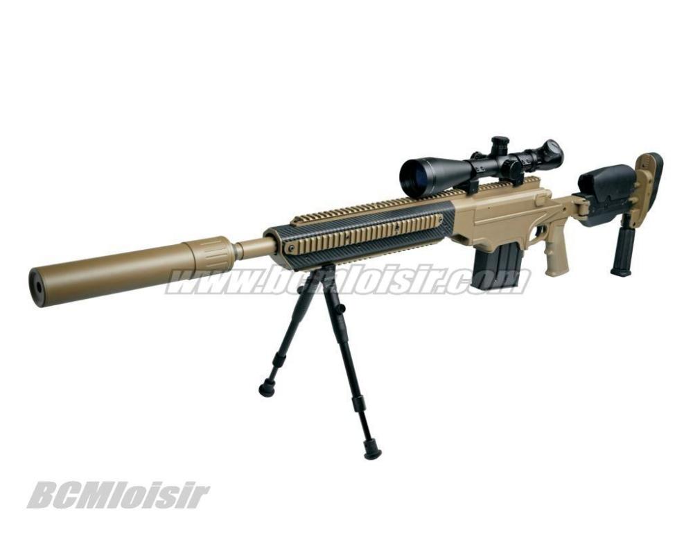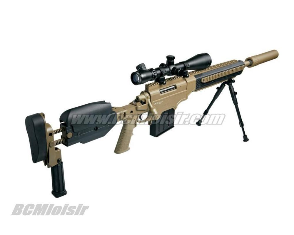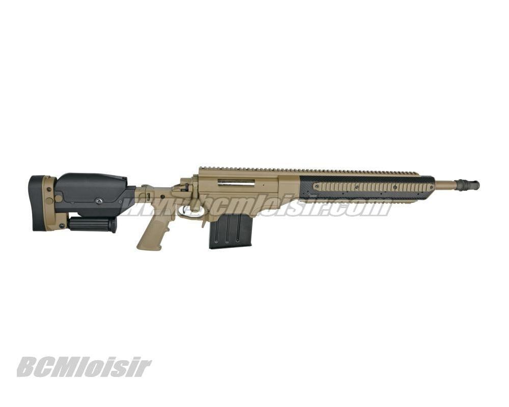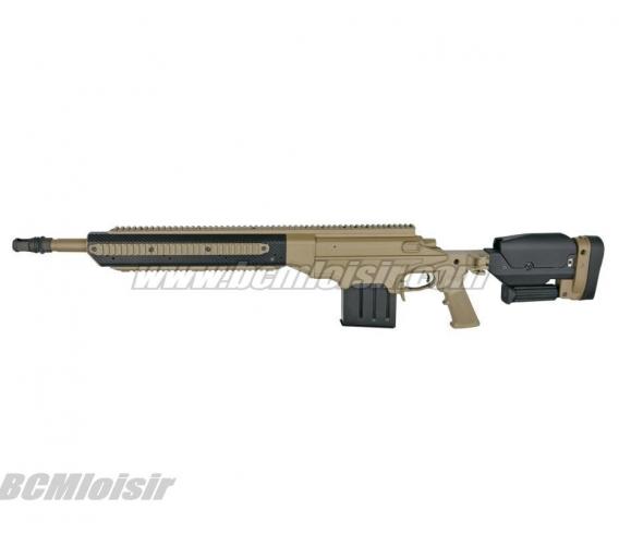 Conçu à partir des dessins originaux en 3D fournis par Ashbury International Group Inc, cette licence complète haut de gamme fusil airsoft ressemble et gère à peu comme la vraie chose. Ce pistolet de précision airsoft dispose d'un rail de longueur supérieure monolithique complète pour les étendues ainsi que d'un coup d'oeil en fibre de carbone avant la fin de avec le rail inférieur et des rails latéraux qui sont co-alignés portait pour le montage bi-pods et autres équipements tactiques. La forme ergonomique de pliage à bouton-poussoir crosse à l'épaule réglable, est monté sur mesure avec des ajustements pour la longueur de stock, joue-pièce hauteur, et verticale de placement tampon de recul. Il est livré avec un champ polyvalent réglable Mono-pod, et un frein de bouche monté avec un fil extérieur important de 28mm pour un montage rapide d'un silencieux désigné (non inclus). Le fusil a un système de chargement unique qui permet le placement correct de la revue pour plus de réalisme.