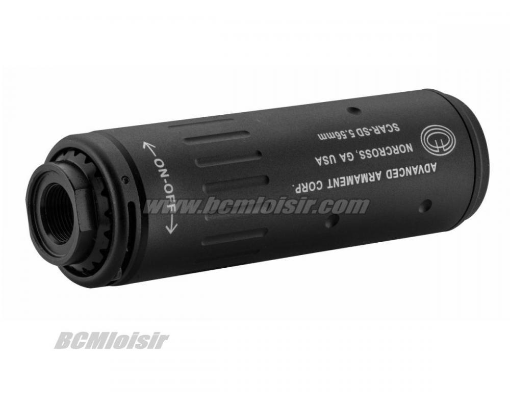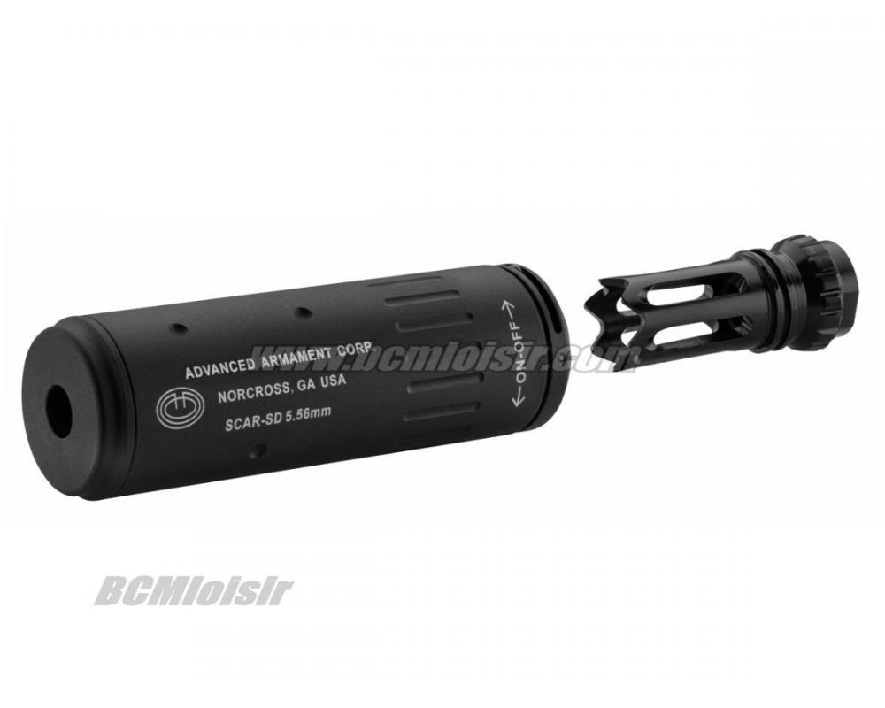 Ce silencieux se monte grâce à son système de filetage rapide directement sur son cache flamme MK16 en acier.
