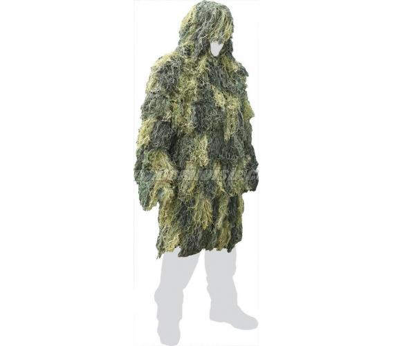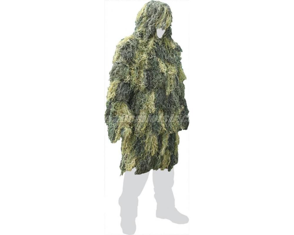 Ce ghillie est composé d'un filet à mailles résistantes sur lequel sont fixées des fibres de longueur et couleur différentes donnant l'impression d'un végétal pouvant se confondre avec la nature!