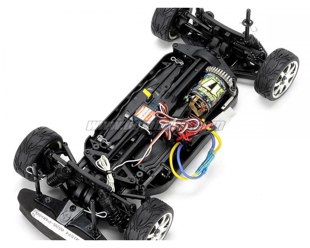 Le châssis est à l’échelle 1/10 à moteur électrique avec une transmission 4x4 intégrale mais sans différentiel central pour mettre la voiture en glisse à chaque virage et contrôler la dérive (c’est le DRIFT).