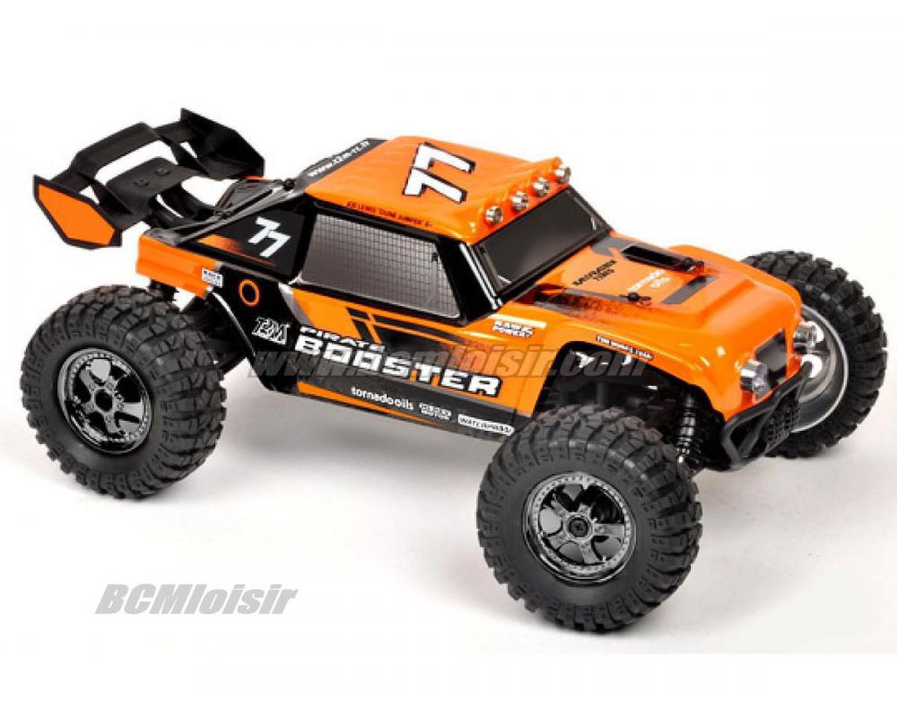 Ce buggy tout terrain 1/10 électrique 4x4 prêt à rouler se caractérise par ses nombreux équipements de qualité pour une fiabilité et des perforamnces optimales. Son robuste châssis, son puissant moteur type 390, sa transmission entièrement sur roulements à billes avec deux différentiels à pignons et cardan central en acier traité, ses suspensions avec amortisseurs hydrauliques et ses pneus surdimensionnés lui permettent de se jouer à grande vitesse des pièges du terrain. Le récepteur radio et le variateur waterproof permettent au Pirate Booster de supporter les projections d’eau ou de neige*. La carrosserie en polycarbonate, replique e celle d’un buggy de rally‐raid, est peinte et décorée. Le pilotage est à la fois vif et précis grâce à un émetteur type volant/gâchette ergonomique 2,4 GHz. Séduisant, rapide, robuste, bien protégé et super équipé, le Pirate Booster est le modèle idéal pour aborder l’univers passionnant de la voiture radiocommandée !