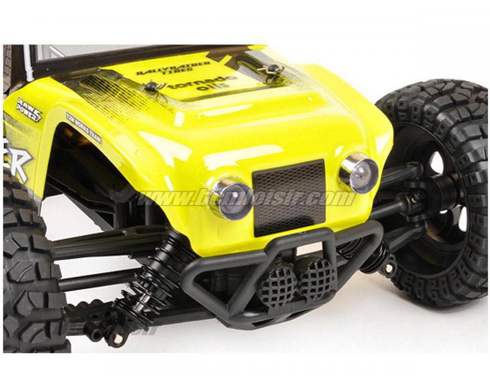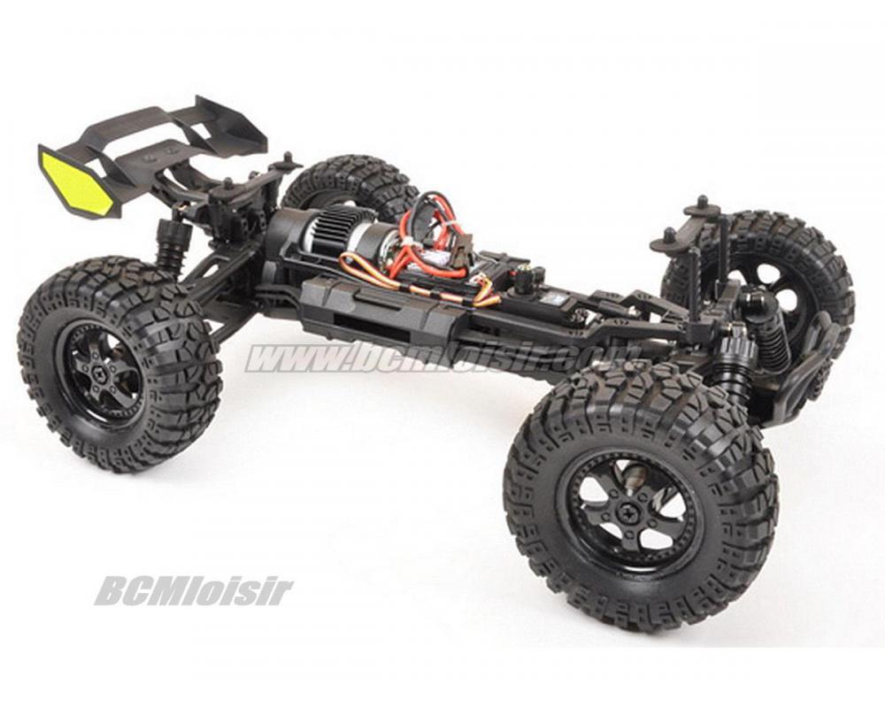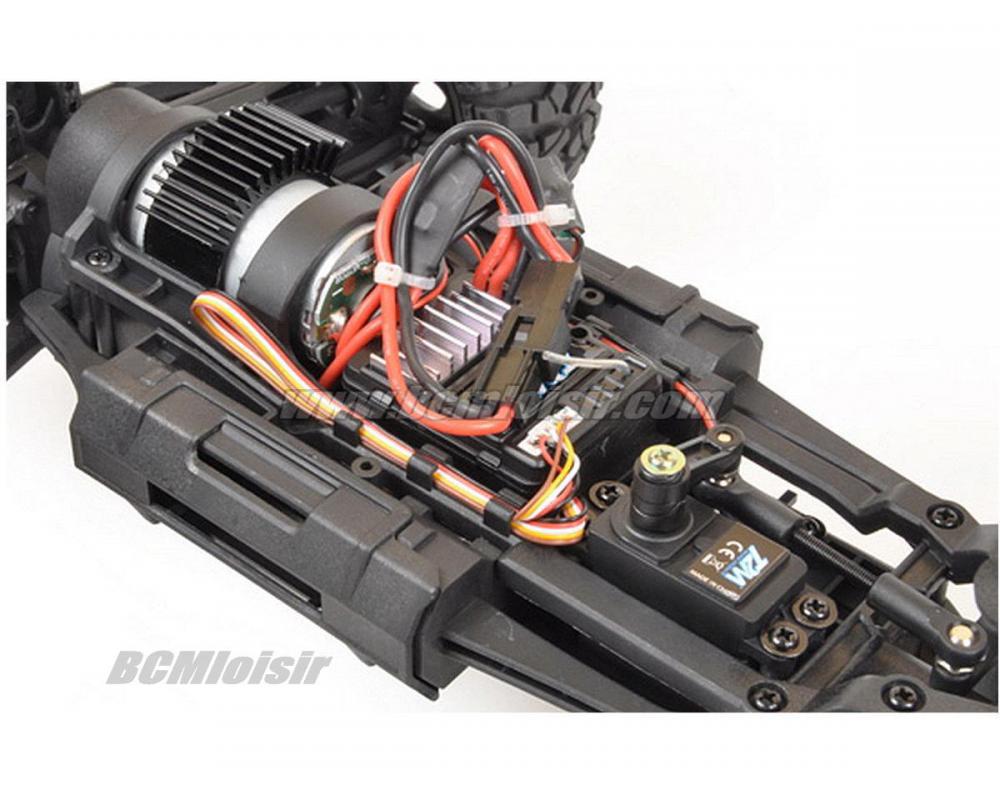 Ce buggy tout terrain 1/10 électrique 4x4 prêt à rouler se caractérise par ses nombreux équipements de qualité pour une fiabilité et des perforamnces optimales. Son robuste châssis, son puissant moteur type 390, sa transmission entièrement sur roulements à billes avec deux différentiels à pignons et cardan central en acier traité, ses suspensions avec amortisseurs hydrauliques et ses pneus surdimensionnés lui permettent de se jouer à grande vitesse des pièges du terrain. Le récepteur radio et le variateur waterproof permettent au Pirate Tracker de supporter les projections d’eau ou de neige*. La carrosserie en polycarbonate, replique e celle d’un buggy de rally‐raid, est peinte et décorée. Le pilotage est à la fois vif et précis grâce à un émetteur type volant/gâchette ergonomique 2,4 GHz. Séduisant, rapide, robuste, bien protégé et super équipé, le Pirate Tracker est le modèle idéal pour aborder l’univers passionnant de la voiture radiocommandée !