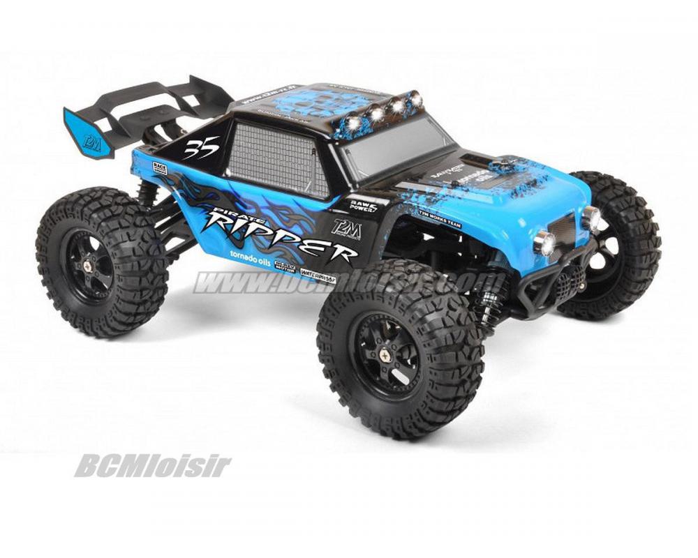 Ce buggy tout terrain 1/10 électrique 4x4 prêt à rouler se caractérise par ses nombreux équipements de qualité pour une fiabilité et des perforamnces optimales. Son robuste châssis, son puissant moteur type 390, sa transmission entièrement sur roulements à billes avec deux différentiels à pignons et cardan central en acier traité, ses suspensions avec amortisseurs hydrauliques et ses pneus surdimensionnés lui permettent de se jouer à grande vitesse des pièges du terrain. Le récepteur radio et le variateur waterproof permettent au Pirate Ripper de supporter les projections d’eau ou de neige*. La carrosserie en polycarbonate, replique e celle d’un buggy de rally‐raid, est peinte et décorée. Le pilotage est à la fois vif et précis grâce à un émetteur type volant/ gâchette ergonomique 2,4 GHz. Séduisant, rapide, robuste, bien protégé et super équipé, le Pirate Ripper est le modèle idéal pour aborder l’univers passionnant de la voiture radiocommandée !