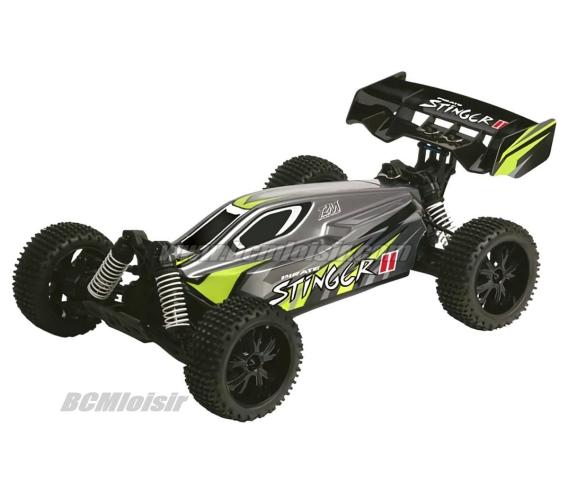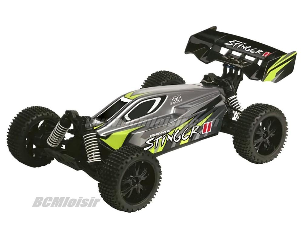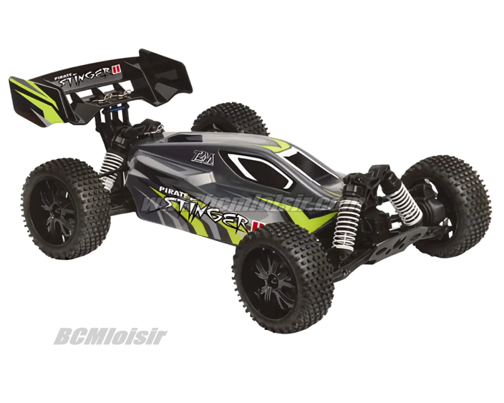 Ce modèle est prêt à rouler avec carrosserie en polycarbonate peinte et décorée. Le Pirate Stinger II est un buggy robuste et performant. Son puissant moteur type 550 et sa transmission 4x4 entièrement sur roulements à billes avec deux différentiels lui permettent d’atteindre 45 km/h. La puissance est gérée par un variateur électronique (Avant/Arrière/ Frein) pouvant être alimenté par pack Li‐Po 2S ou Ni‐MH 5 à 9 éléments. Les cardans avant et arrière sont en acier traité. La suspension à quatre roues indépendantes et quatre amortisseurs hydrauliques et les pneus tout terrain Hi‐Grip Mini‐Blocks lui permettent d’évoluer à haute vitesse en terrain accidenté. Pour adapter le Pirate Stinger II à tout type de situation, Il est possible de modifier l’empattement (335 ou 338mm) la position des amortisseurs et d’ajuster leur dureté au moyen d’une molette de réglage de précontrainte du ressort. Aileron en nylon à incidence réglable assorti. Avec le Pirate Stinger II, découvrez la robustesse et les performances d’un véritable buggy 4x4 radiocommandé !